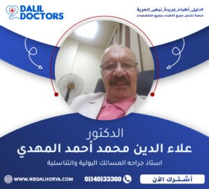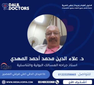 أستاذ جراحة المسالك البولية والتناسلية، يتميز بخبرة واسعة في تشخيص وعلاج أمراض الجهاز البولي والتناسلي وإجراء العمليات الجراحية الدقيقة في هذا المجال. سعر الكشف: 600 جنيه.