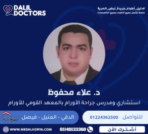 ويتميز د. علاء محفوظ بدقة عالية في الأداء الجراحي وحرص دائم على مواكبة أحدث التقنيات الطبية العالمية في جراحات الأورام.