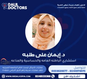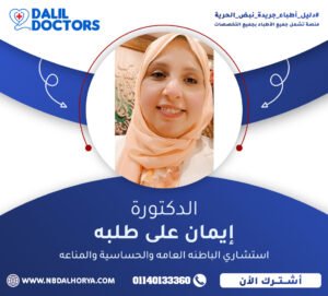 د. إيمان علي طلبه هي إحدى الكفاءات الطبية المتميزة في مجال الباطنة العامة والحساسية والمناعة، بخبرة تمتد لأكثر من 20 عامًا في تشخيص وعلاج الحالات المعقدة والاضطرابات المناعية والحساسية المزمنة. تشغل حالياً منصب استشاري الباطنة العامة والحساسية والمناعة، بالإضافة إلى عملها الأكاديمي كـمدرس بكلية الطب – جامعة حلوان.