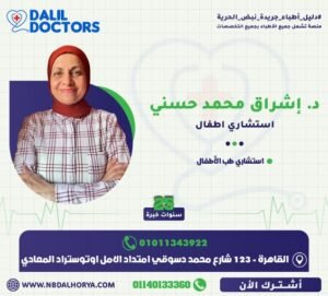 د. إشراق محمد حسني هي استشارية متميزة في طب الأطفال، تمتلك خبرة تمتد لأكثر من 25 عامًا في متابعة وتشخيص وعلاج مختلف حالات الأطفال من الولادة وحتى سن المراهقة. تتميز بأسلوبها الإنساني في التعامل مع الأطفال وذويهم، وحرصها الدائم على تقديم رعاية صحية شاملة تعتمد على أحدث الأساليب العلمية والطبية.