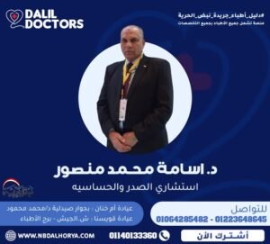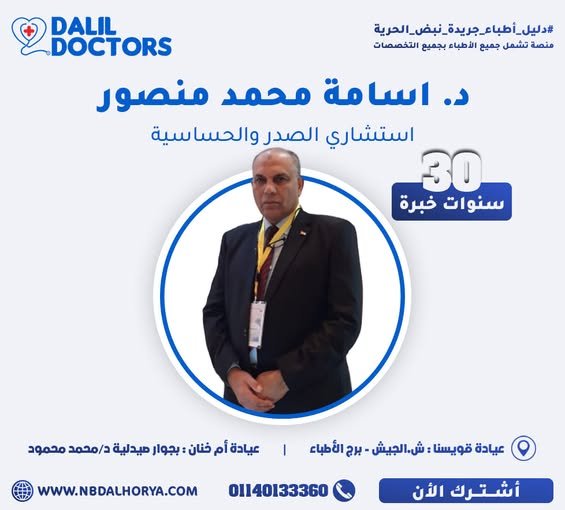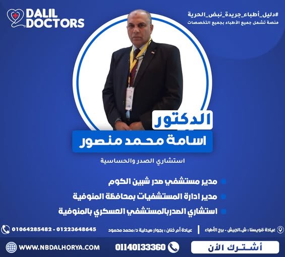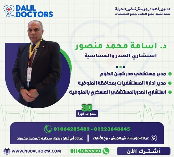 يُعد الدكتور أسامة محمد منصور من أبرز الأسماء في مجال أمراض الصدر والحساسية بمحافظة المنوفية، حيث يتمتع بخبرة تزيد عن 30 عامًا في تشخيص وعلاج أمراض الجهاز التنفسي والحساسية.
