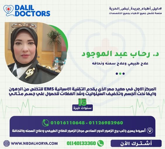 تتمتع د. رحاب عبد الموجود بخبرة تمتد لأكثر من 18 عامًا في مجال العلاج الطبيعي، وتخصصت في علاج السمنة والنحافة باستخدام أحدث التقنيات العالمية. تُعرف بكونها من أوائل المتخصصين الذين أدخلوا التقنية الإسبانية الحديثة EMS إلى صعيد مصر، وهي تقنية متطورة تعمل على التخلص من الدهون، نحت الجسم، شد العضلات، وتخفيف السيلوليت بفعالية عالية، مما يساعد على الوصول إلى جسم مثالي في وقت قياسي وبدون مجهود شاق.