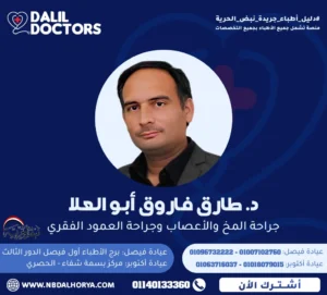 يُعد الدكتور طارق فاروق أبو العلا أحد أبرز الاستشاريين في مجال جراحة المخ والأعصاب وجراحة العمود الفقري، بخبرة تمتد لأكثر من 23 عاماً في تشخيص وعلاج الحالات الدقيقة والمعقدة، بما في ذلك الانزلاق الغضروفي، أورام المخ والحبل الشوكي، والكسور والإصابات العصبية.